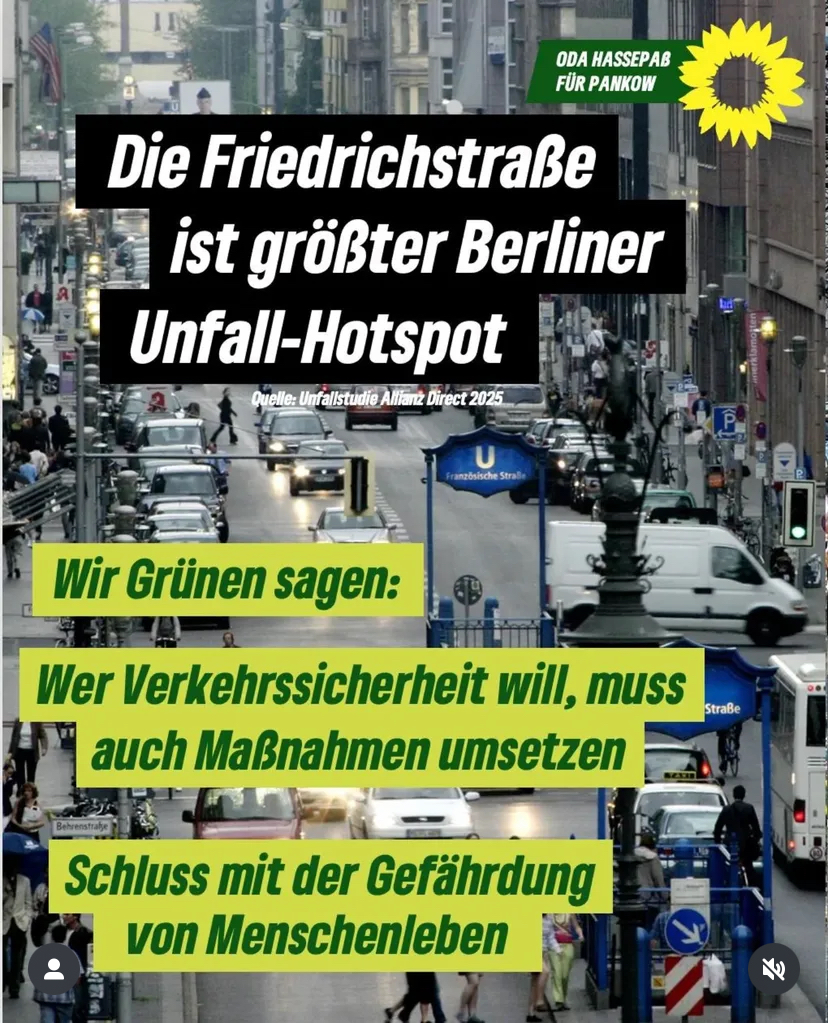 „Die Friedrichstraße ist unter CDU-Ägide wieder zu einer der gefährlichsten Straßen bundesweit mutiert: 49 Unfälle mit Verletzten – vier davon schwer – allein im Jahr 2024. Die neusten Unfallzahlen zeigen, dass das Risiko von Verkehrsunfällen stark steigt, wenn der Raum nicht mehr den Menschen gehört.